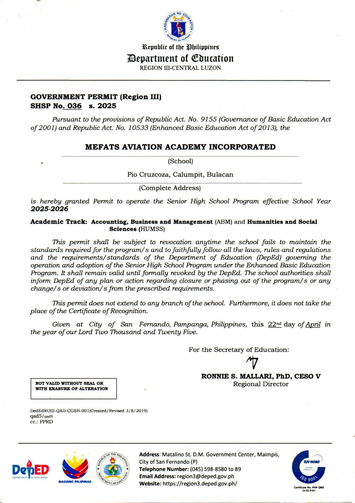 Mefats Aviation Academy has received government permit to operate the Senior High School program starting in the 2025-2026 academic year — Government Permit (Region III) SHSP No. 036 s. 2025