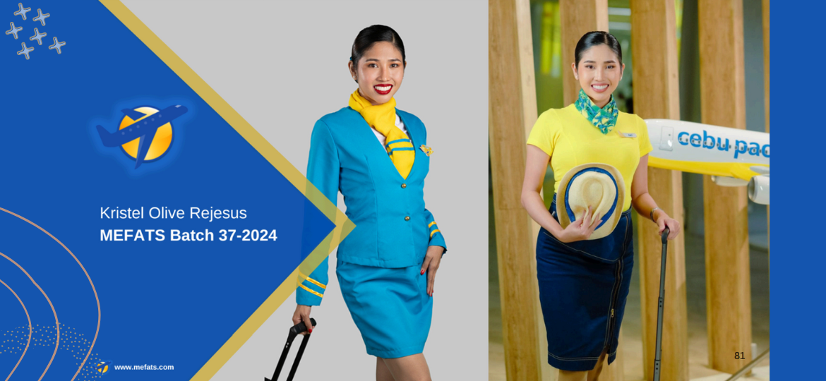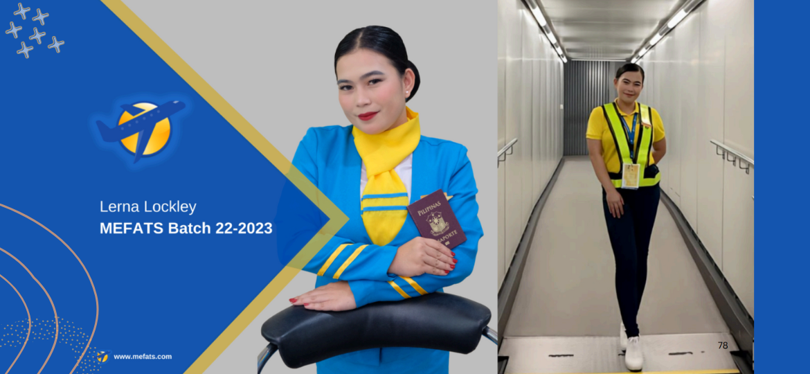 There is a single "you" who has a dream for "you". Dreams are high and quite impossible to imagine. But nothing can stop us from dreaming of extraordinary aspirations for the future. Working in the aviation industry is an example of everyday continuing work experience. Every day has the same routine, but it's all different scenarios. Always remember: first, you must believe in yourself; second, discover what you like to do and keep improving; and lastly, don't just dream. Write it down. It's really "MEFATS CHANGED MY LIFE". MEFATS taught me the importance of believing in yourself, turning my fear into courage, and always remain humble and kind to all people you meet. MEFATS WILL HELP, TRAIN, AND DEVELOP YOU FOR YOUR DREAMS AS CABIN CREW.